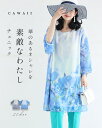 (S~2L対応)華のあるオシャレを 素敵なわたし チュニック / レディース 華やか 素敵 オシャレ きれいめ 水彩画 体型カバー チュニック ブルー グレー 青 灰色 40代 50代 60代