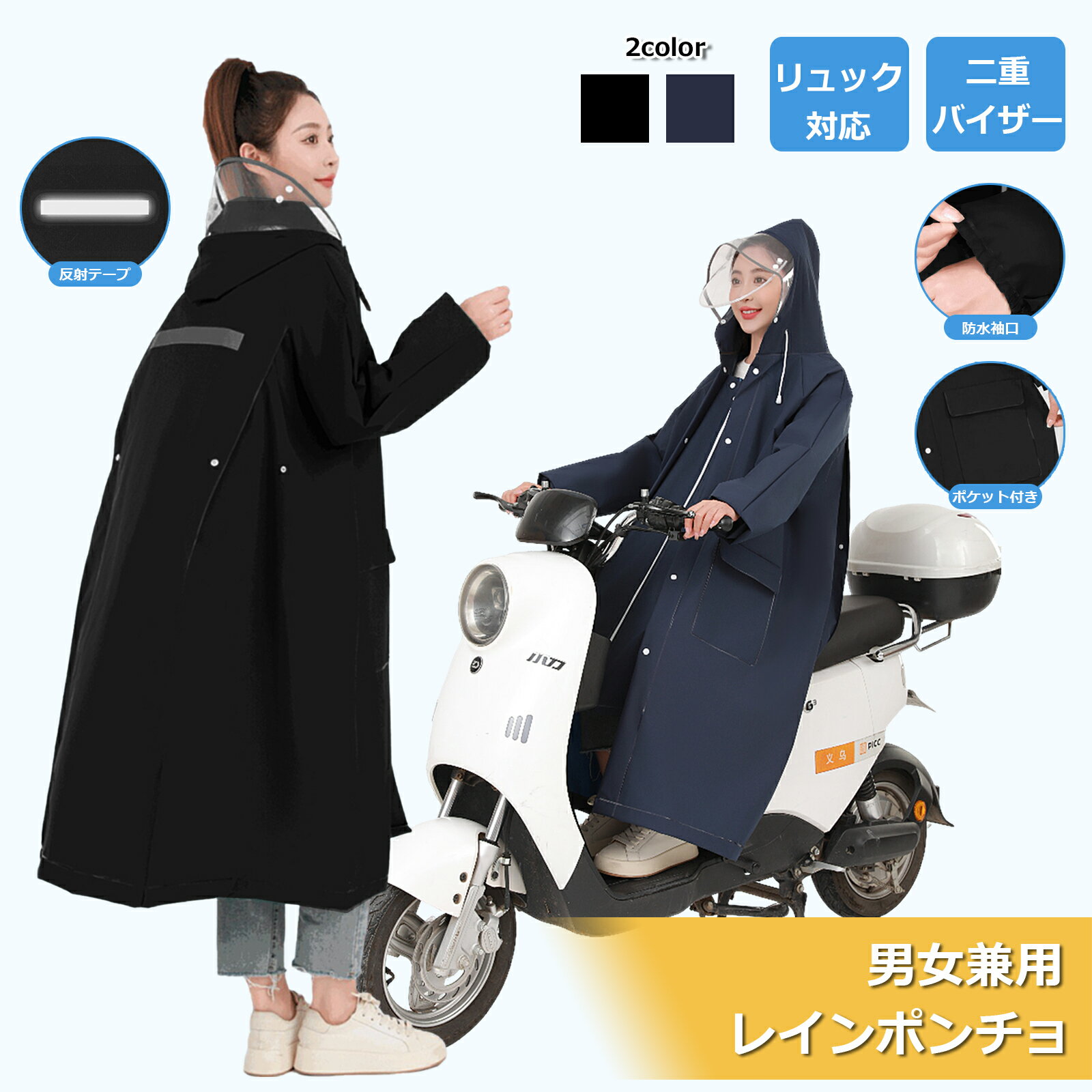 レインコート 自転車 リュック対応 【2023新型 二重つば】 レインポンチョ メンズ ロング丈 大きいサイズ バイク ポンチョ カッパ 撥水 防水 防風 耐久 レインウェア 雨具 梅雨対策 男女兼用 通勤 通学
