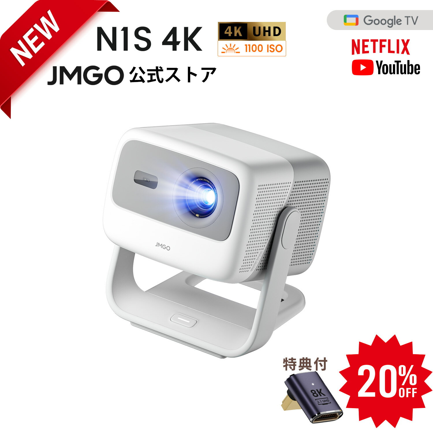 【予約特典 20%OFFクーポン+L字型HDMIアダプタ】JMGO N1S 4K 3色レーザープロジェクター Netflix対応 コンパクト明るい FHD 高画質 HDR10 ジンバル一体型 プロジェクター GoogleTV ホームシアター 家庭用 天井 自動台形補正 小型 フルHD 一人暮らし