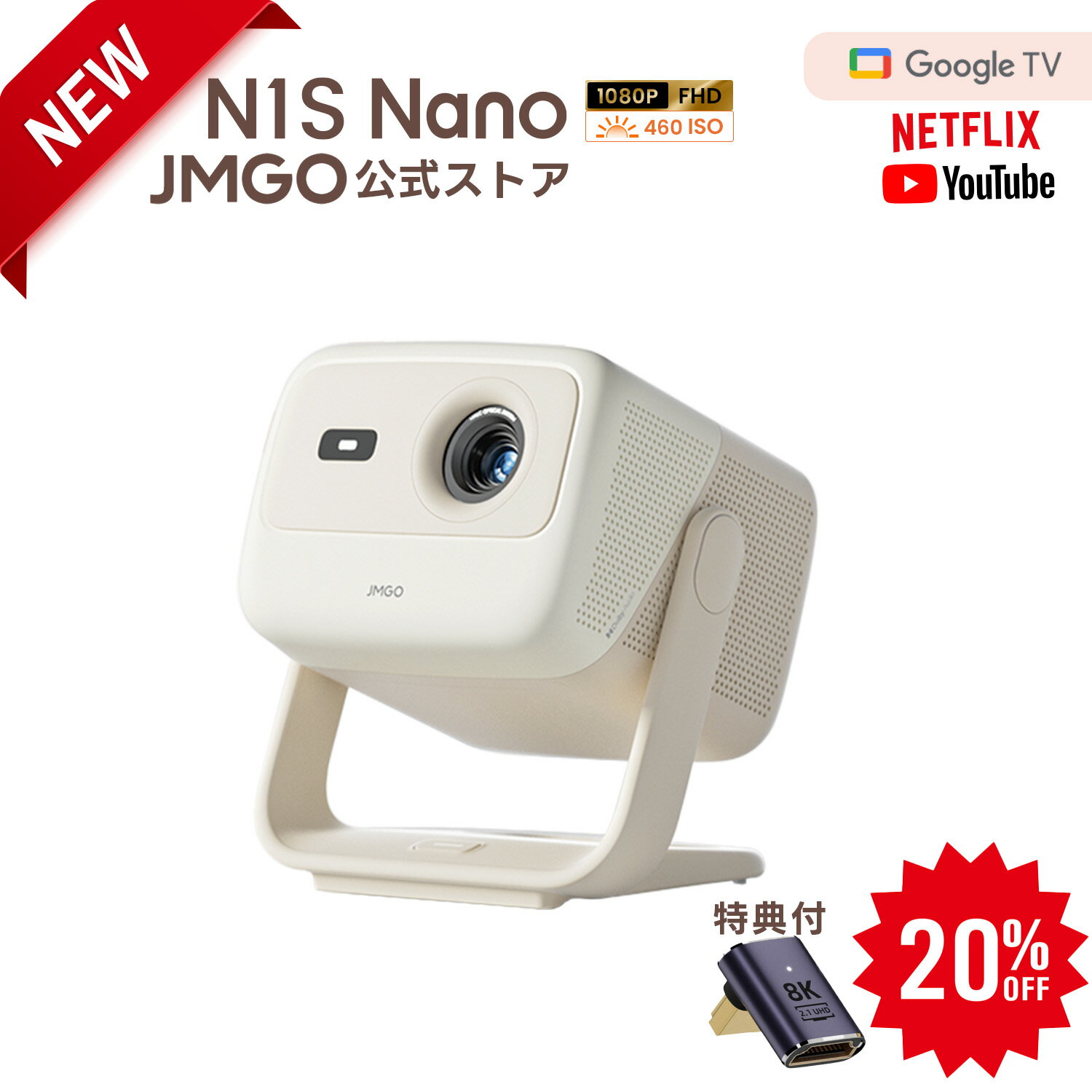 【予約特典 20%OFFクーポン+L字型HDMIアダプタ】JMGO N1S Nano フルHDプロジェクター Netflix対応 コンパクト明るい FHD 高画質 HDR10 ジンバル一体型 プロジェクター GoogleTV ホームシアター 家庭用 天井 自動台形補正 小型 フルHD 一人暮らし