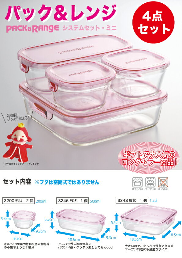【特別価格】iwaki(イワキ) パック&レンジシステムセット・ミニ (ピンク) 耐熱ガラス ガラス 保存容器 保存